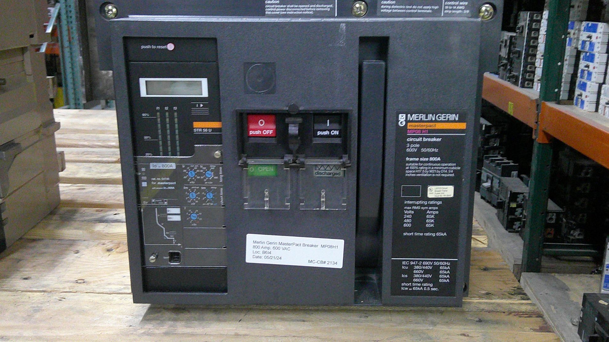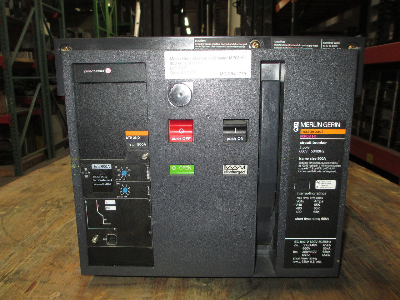 Merlin Gerin MP08 H1 Masterpact circuit breaker; 800 amp, 600 volt AC, 3 pole. With 600 amp rating plug cat.# 54745, STR 58 U trip unit, LSI functions, auxiliary switches, overcurrent trip switch, alarm, shunt trip, manually operated (M/O), draw-out (D/O), used tested with report.
