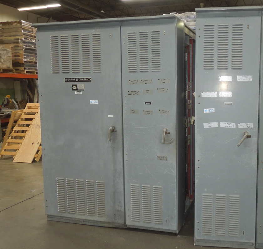 Square D QED Power Style Switchboard; 2500 amp SE main breaker, 480Y/277 volt AC, three phase, four wire, LSIG functions, ground fault, NEMA 3R outdoor. With (2) breaker distribution panels. Reconditioned & guaranteed with a one-year warranty.